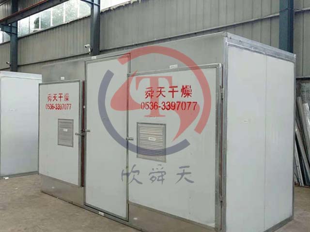 箱式烘干机,外观看就是一个立方体,有上下左右之分,上下是风道,右侧也是风道并装有风机,风机是双向的,可以正反转,箱体左侧是烘干机的主要部